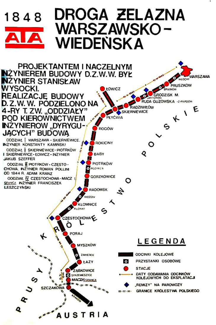 14 июня 1845 г. было открыто движение поездов до города Гродзиск-Мазовецкий, тогда же в Варшаве был построен Венский вокзал. А уже 15 октября того же года – дорога дошла до Скерневице с веткой на Лович, и она стала открыта для всеобщего пользования. В 1846 г. дорога достигла Ченстоховы, в 1847 г. Зомбковиц, а в 1848 г. – пограничной станции Граница (в настоящее время Сосновец-Мачки). В отличие от ранее построенной в 1837 г. Царскосельской железной дороги, рассматривающейся как «увеселительной» и обслуживающей, в основном, нужды царского двора и аристократии, Варшаво-Венская с самого начала получила важное экономическое значение, и использовалась для транспортировки руды и угля Добровского (Домбровского) горно-добывающего бассейна в Пруссию и постройки металлургических заводов для нужд России. Это были заводы Гута Банкова, на которых, как нельзя кстати, стали изготавливать рельсы для первых ж.д. царства Польского.