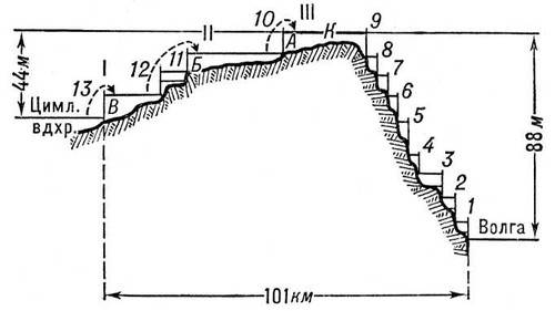 Поперечный профиль водораздела между Волгой и Доном и вариант его преодоления шлюзами проекту Н.П. Пузыревского