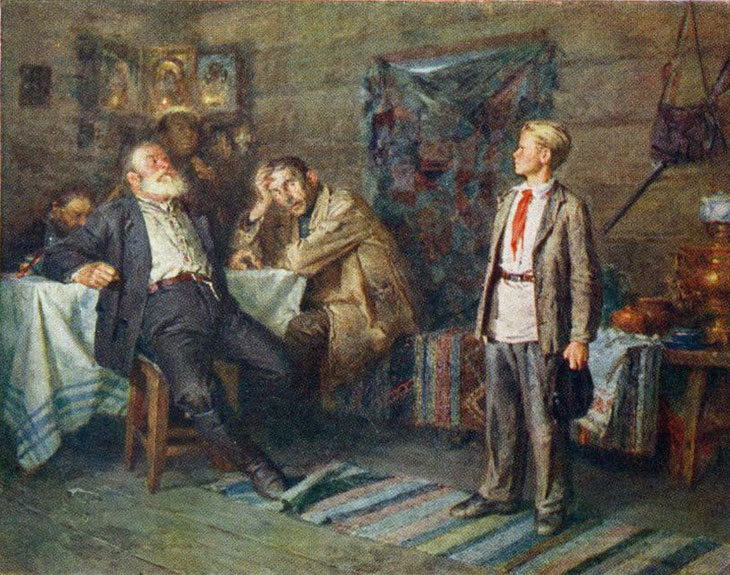 Павлик Морозов на допросе кулаков, худ.В.Чебаков 1954 г.