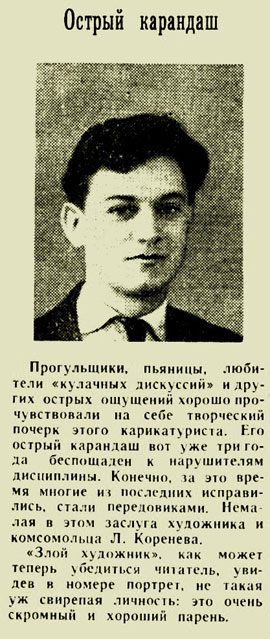Я «ушел в тень». Я ничем не выделялся в своей группе, а тем более – на курсе. Моя энергия переключилась на творческую деятельность в лиижтовском театральном коллективе. И все же я по комсомольской линии выполнял многие поручения в основном как художник-карикатурист в стенгазете факультета; в