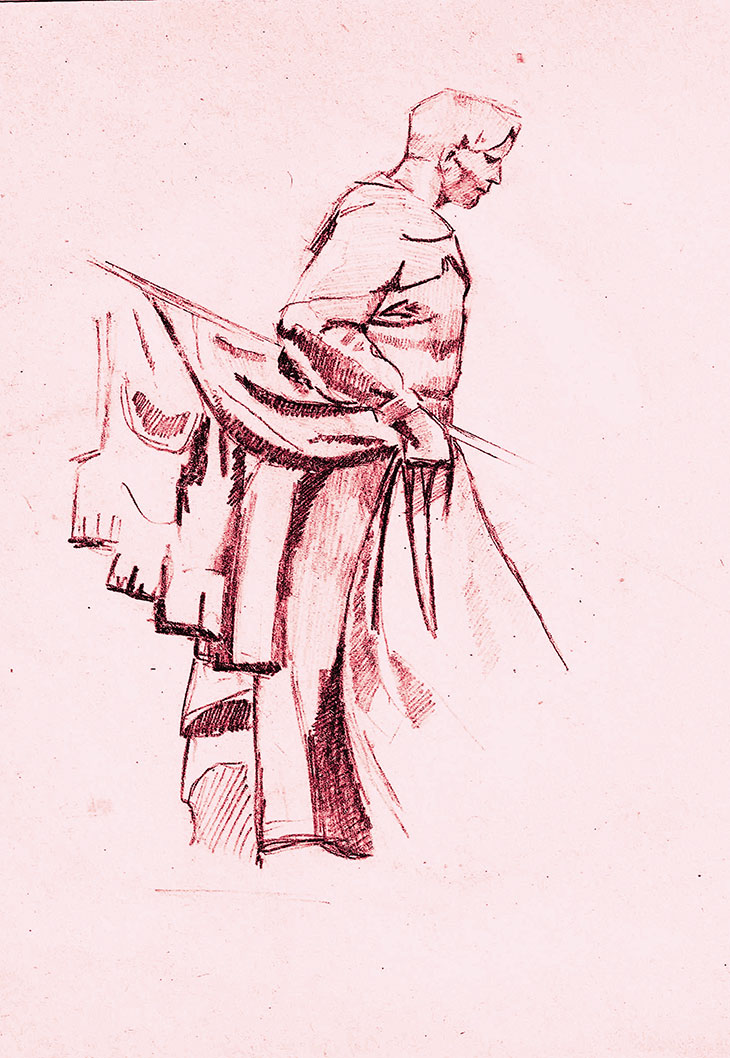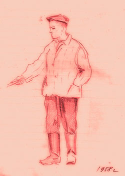 В моём небольшом блокноте сохранилось несколько зарисовок той поры, например, акварель «Дом в Печково» и набросок самодеятельного гитариста С.Тарасенко, Были и несколько записей, как-то: состав концертной бригады (Михеева Лена, Знахуренко Эрик, Тарасенко Сергей) и состав оформителей-художников: Новгородова Наташа, Зимин Лёва. При этом эти ребята почти не снимались «с полей», а делали все свои творческие самодеятельные работы вечерами. Хочется особенно выделить из артистов Знахуренко Эрика (игра на деревянных ложках). А из художников выделю Лёву Зимина, который «по памяти» выделывал чудеса при оформлению нашей столовой. Выпуском сатирических номеров «Смех и слёзы», как и бывало, занимался я лично.