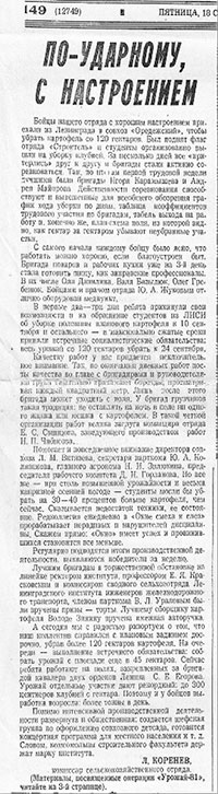 Всё также за нами были 120 гектаров картофеля плюс 40 га сверх плана (при урожайности в 300 центнеров с га). И всё также мы работали в бригаде Степана Степановича Егорова – ветерана Великой Отечественной войны, кавалера орденов Ленина и Трудового Красного Знамени и лучшего полевода Ленинградской области. Уборка была налажена качественно и происходила поочередности от одного поля к другому и связана она была со сроками созревания клубней.