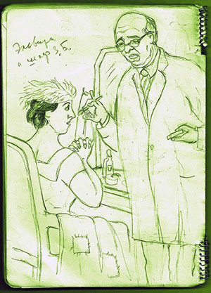 Казалось все прошло блестяще: бурные аплодисменты, одобрительный гул голосов и очередь для дарения букетов цветов исполнительнице и умнице Галине Костиной, как вдруг воцарилось всеобщее затишье и тревога в рядах почитателей актрисы. Оказывается она в полуобморочном состоянии буквально всем телом осела на близь стоящий стул, руки её повисли словно плети. Ни опрыскивание её водой, ни самодельные веера не приводили её в чувство. Кто-то начал даже делать грудной массаж её сердца. Ваш покорный слуга пробился к её изголовью и насильно протиснул ей под язык валидол…(никогда не брал на такие мероприятия никаких лекарств, а тут какое-то провидение мне подсказало – Возьми валидол!) Через три-пять минут она, наконец, раскрыла глаза, ей дали попить и Галочка наша очнулась. Слезы были на её глазах, слёзы были на глазах у многих, – Галина Алексеевна, как же Вы так? Может быть Скорую помощь вызвать? – Говорили тут многие. Она категорически от этого отказалась . В общем, все обошлось, и потихонечку снова все стали продолжать одаривать Галину Костину цветами и словами благодарности и поддержки. Не преминул и я подарить свой альбомчик времён 1959 г. со своими набросками её и её друзей самодеятельного драмкружка и небольшую коробочку конфет. Я поцеловал её в щечку, говоря, – Это я, тот Лёня Коренев, которого ты успела позабыть. Поправляйся и не пугай нас больше так!