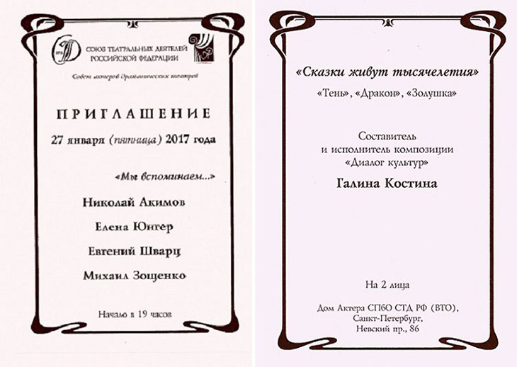 Короче, мы договорились встретиться в Доме актера 27 января 2017 г. после её моноспектакля – «диалог культур» и более детально поностальгировать снова. Погода в этот назначенный день была «лондонской» – туман, промозглость и к этому примешивалась грусть и радость 73 –ей годовщины полного снятия блокады Ленинграда... Конвертик с пригласительным билетом на два лица, уже дожидался на столике дежурного администратора в вестибюле Дома актера. Я и моя супруга никогда не были в этом шикарном здании (бывшего парадного дома князей династии Юсуповых; а всего в Петербурге подобных дворцов и домов находилось не менее 7 ) и были приятно удивлены его интерьерами. Зрительный зал особняка был просторный, но наполнился довольно быстро. Удивило и то, что помимо заядлых театралов и ветеранов сцены в зал пришло и много молодежи и некоторые с букетами цветов и небольшими презентами. В театральный зал пришли и деятели из актерской среды, лица которых нам с супругой были знакомы, но фамилии их мы позабыли. Всё это, и нарядно одетая Галина Костина в какое-то особо скроенное концертное платье, только подчеркивали важность актерского действа и поднимало настроение.