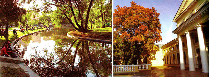 Юсуповский сад - вид с прудом (слева). Выход на Бельведер Юсуповскрго сада (справа)