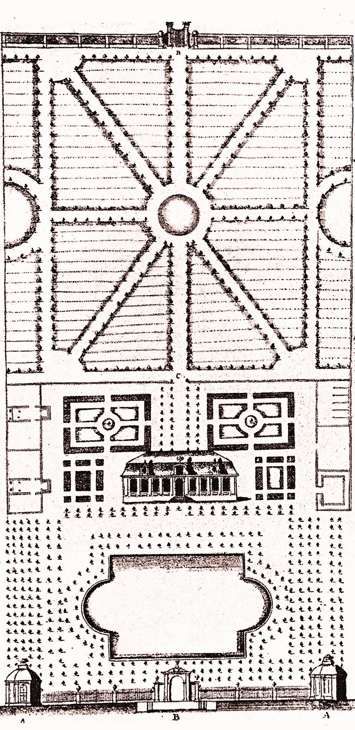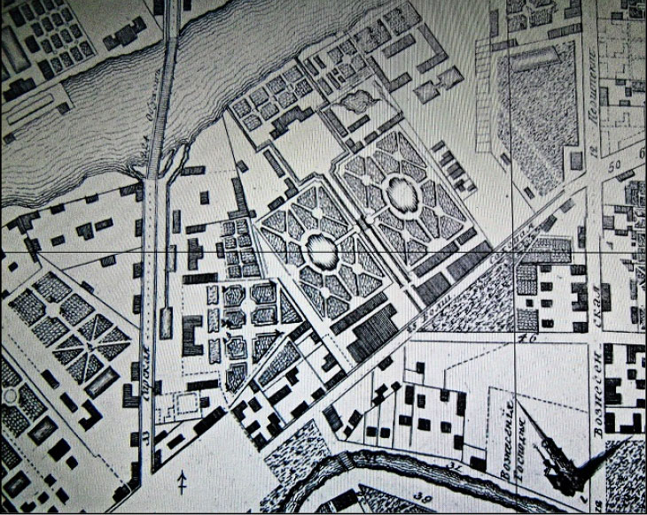 Автор этого очерка нашел редкий чертеж планировки Юсуповского сада начала XIXв., на котором хорошо просматриваются и мелкие детали, такие, как расположение помещений дворца, так и прогулочные садовые аллеи и даже бьющий ключ, вода из которого по ручью стремится к пруду. Тут же отметим, что редко, кто из авторов, посвящающих свои статьи дворцу на Фонтанке, освещает такой вопрос, как то, что на фронтоне, обращенном к набережной, красовался хорошо вылепленный картуш с гербом Юуповых2. Возможно это мелочь, но Юсупов в этот период предполагал принять саму матушку императрицу. Поэтому каждой мелочи он придавал значение – княжеский дворец и вся его усадьба должны были блистать. Характерен в этом отношении такой эпизод по украшательству, который осуществил Н. Юсупов. Так по его «капризу» на крыше его дворца были установлены на постаментах статуи греческих богов. Подобный редкий феномен автор этого очерка смог отыскать только на крыше Пушкинского дома, не считая, конечно, царской резиденции «Зимний Дворец».
