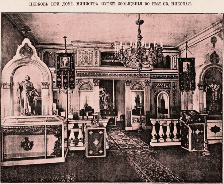 Не скрою, что в истории многочисленных реконструкций внутренних апартаментов дворца Юсупова уже после 1810г. есть место лакунам, которые исследователи-историки либо обошли своим молчанием, либо, глубоко не изучая архивы, сделали свои предположения, вытекающие, как бы, из предыдущих фактов. Вот яркий пример. Помещением во дворце церкви во имя Святого Николая Чудотворца считается то, стены которого дошли до наших дней. Юсупов её велел расположить именно в этом пространстве, но почему-то не освятил. Освящение её произошло гораздо позже, в 1832 г. Но вот обнаружено фото, на котором изображено совсем другое помещение этой же (?) церкви и название фото гласит: Церковь Николая Чудотворца при доме министра путей сообщения в бывшем Юсуповском дворце. Что это? Какое конкретно помещение?