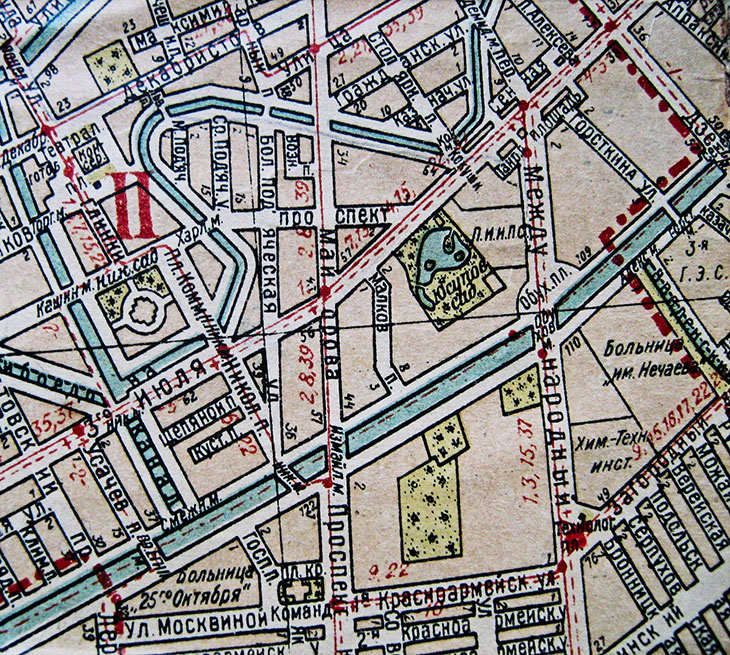 – В 1893-1894 гг. в правом углу сада были воздвигнуты дом для дирекции Общества спасения на водах и склад при нем, арх. П.Купинский;