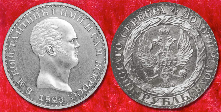 [1]Ни одна из отечественных монет не породила столько легенд и фантастических измышлений, как Константиновский рубль, что не удивительно, если вспомнить, что до смерти Николая I лишь единицы знали об этом нумизматическом курьезе. По указанию министра финансов Е. Ф. Канкрина в декабре 1825 г. было изготовлено 5 (по одной из версий – 6) экземпляров таких рублей. Шестой экземпляр и платы для их оттисков были оставлены гравером Я. Рейхелем у себя и о «судьбе» их ничего не было неизвестно. Экземпляр был срочно отправлен в Варшаву для утверждения предполагаемым новым императором. Как известно Вел. Кн. Константин отказался занять трон в пользу Вел. Кн. Николая… Поэтому у коллекционеров эти рубли стали самыми дорогими, а в виду их малого количества появилось много их подделок. Существовало мнение, будто 6-й экземпляр уникального рубля Я. Рейхель сделал задним числом с помощью способа гальванопластики, изобретенного Я. Якоби, которым он в совершенстве владел, и т.д. . Известен факт его продажи на аукционе на Западе за $ 1 000 000 - рекордную сумму для монет России. В общем, он бесценен…