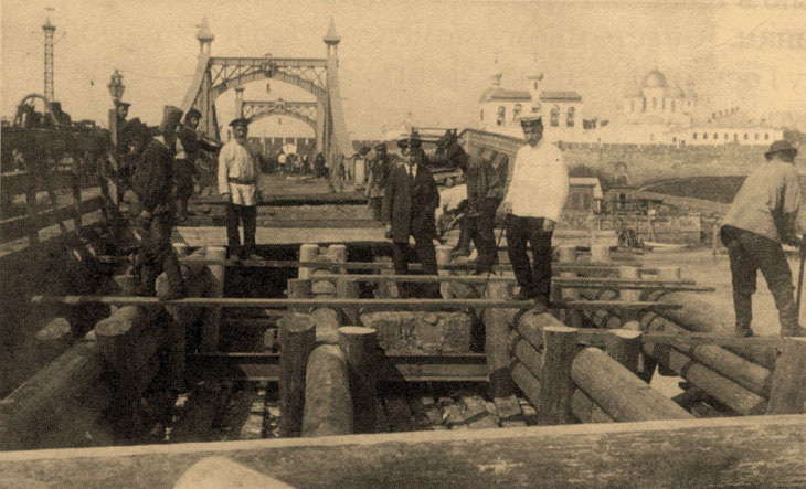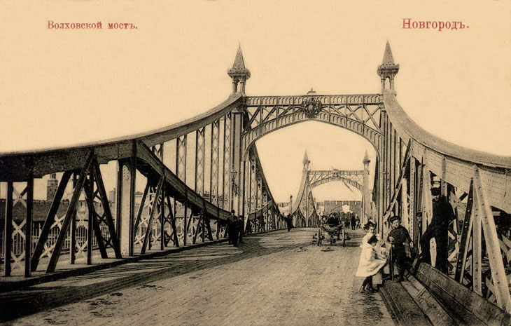 На вышепредставленных 2-х фотографиях показаны проект модернизированного Волховского моста Рейхеля (автор металлических конструкцийнового моста инженер-путеец Г.Н. Соловьёв) и его реализация в виде "горбатых" неразрезанных ферм с ездой понизу. На следующих уникальных 3-х фотографиях (см.ниже) представлены фото этого металлического моста в процессе его ремонтов и эксплуатации. Мост прослужил до 1943 г., когда и был взорван фашистами.