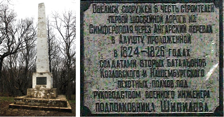 Обелиск строителям первого шоссе в Крыму и памятная доска (обновленная) на ней.