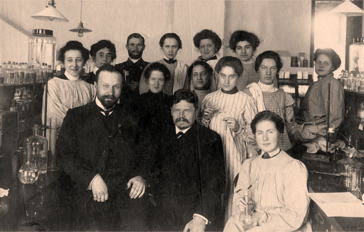 Группа стдентов в Химической лаборатории Пединститута, 1907г. (Е.В. стоит 1-я слева)