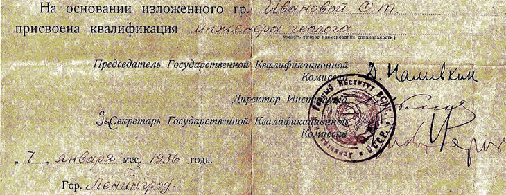[9]Не могу не поделиться тем обстоятельством, что моя мама, окончившая Горный институт в 1936 г., защищала свою дипломную работу в Госкомиссии, возглавляемой Д.В. Наливкиным. Я располагаю его автографом в виде подписи на дипломе моей мамы. А на третьем курсе профессор Наливкин читал им дисциплину «Палеонтология». Хотя мама и очень боялась этого «серьёзного дядечку», но на экзамене он выставил ей «хорошо».