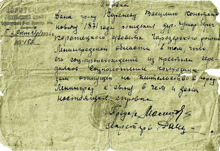Сестра стала работать при Канонерском заводе лодочницей-перевозчицей через Канонерский канал, а братья, не имея постоянной прописки, трудились там, где бог даст. Забегая вперёд, отметим в судьбе двух последних одинаково печальную и героическую страницу в их жизни: оба ушли добровольно защищать город Ленинград и погибли, его защищая, в 1941 г. А до этого мой папа, Иван Васильевич, встретил мою маму (Ольгу Тимофеевну) и в 1936 г. они поженились. И стали они жить-поживать по адресу, где проживала мама – пр. М.Горького, д.27, кв.40. Сюда в этом же году к сыну и свекрови отпустили на проживание со справкой из Коротецкого сельского совета моего деда пенсионера и вдовца, Василия Константиновича.