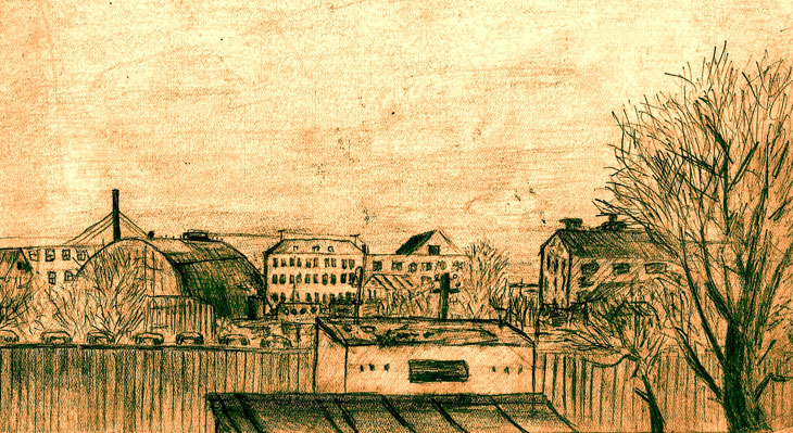 Вид из окна на номерной завод, рис.автора, 1951 г. (теперь 8 павильон ЛЕНЭКСПО)