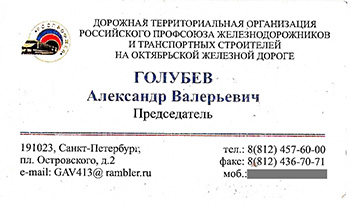 С новым руководителем профсоюзной организацией Октябрьской железной дороги (Роспрофжел) – Голубевым Александром Валерьевичем я познакомился в конце 2015 г. До этого я хорошо общался с его предшественником Владимиром Леонидовичем Белозеровым (не путать с нынешним главой ОАО РЖД – Белозеровым Олегом Валентиновичем). Владимир Леонидович являлся и представителем в Общественной палате РФ от РЖД, а многие годы работы в ЛИИЖТе - ПГУПСе был моим коллегой.