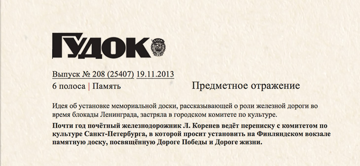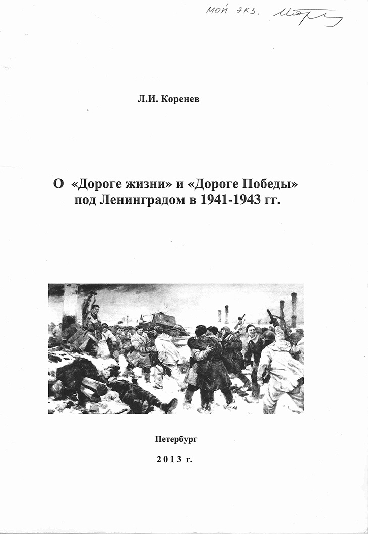 Могу также отметить, что в 2014 г. все семь пунктов и Послесловие этой моей книжки были выложены в моем Сайте – korenev.orgв разделе «Вторая мировая война». А ещё 5 экземпляров мне решил подарить директор нашей типографии уже в 2016 г. Параллельно мною при моральной поддержке общественной организации КИПС велась работа по установке памятной доски на фасаде Финляндского вокзала. Именно этот вокзал явился основным звеном в деле беспримерной эвакуации в мирена Большую землю людского потока изможденных ленинградцев в условиях тотального голода и разрухи, при прямых смертельных воздействиях со стороны армады фашистских захватчиков.
