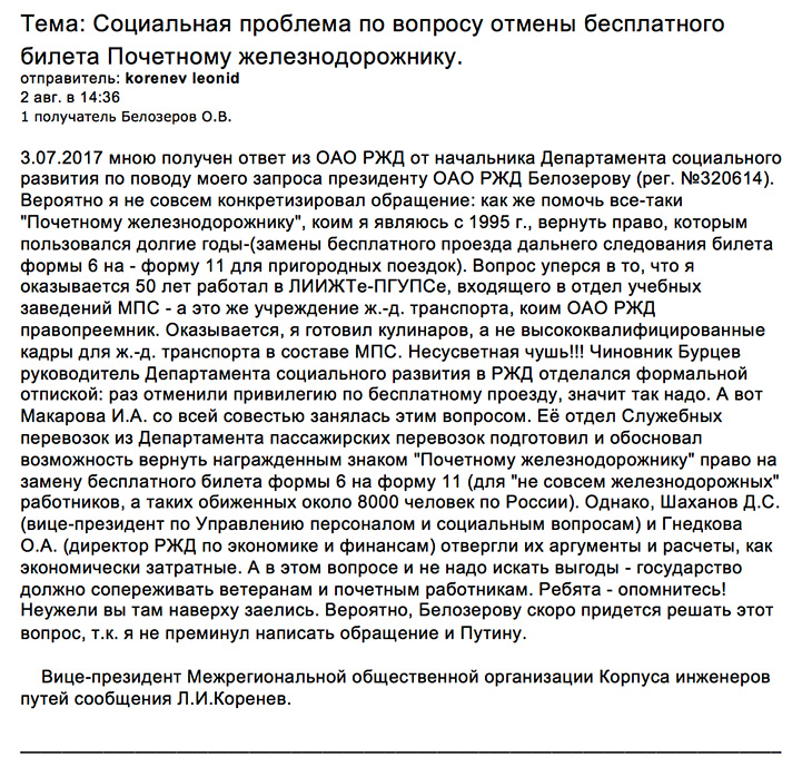 Теперь о второй моей встрече с А. Голубевым. Произошла она в марте-апреле 2017 года. Дело в том, что я, предвкушая весенние работы в садоводстве на участке сына в 6 соток, решил приобрести льготный проездной билет формы 11, как награжденный знаком «Почетному железнодорожнику». Таким правом я пользовался уже лет 7-8. Итак, 31 марта я направился в Билетное Бюро служебных билетов, что на Витебском вокзале для оформления такого билета. Однако мне вежливо отказали, сославшись на какое-то служебное постановление. Я, конечно, возмутился, но не шумел, а уныло пошел домой. Все-таки у меня имелась альтернатива. Я же мог воспользоваться, как пенсионер, льготой от городских властей, и стоимость билета при этом составляла бы лишь 10% от – полной! Ночь я спал спокойно, но утром меня стала «грызть» моё самолюбие: собственно, почему я должен терять единственную привилегию как «Почётник»? И пошло-поехало… Уже 5 апреля в злосчастном Билетном бюро я требовал показать мне «бумагу», согласно которой я был лишен такой льготы. «Бумагу» не показали, но начальнице Бюро Светлане Владимировне под моим напором пришлось соединить меня по телефону с Московской чиновницей из Департамента служебных пассажирских перевозок Макаровой Ириной Александровой. В дальнейшем с её подач при нескольких телефонных разговорах с ней, а также моих заковыристых вопросов, я отвоевывал у чиновницы одну позицию за другой в отношении нужной мне информации о служебной иерархии в РЖД… Сказалось и то, что, наконец-то в ведомстве появилась электронная почта главы ОАО РЖД, чего не было у предыдущего её главы Якунина! Параллельно я рассылал электронные письма-жалобы в территориальное и центральное Федеральные агентства железнодорожного транспорта (ФАЖТ), в департаменты РЖД. Везде – непонимание или отрицательные ответы.