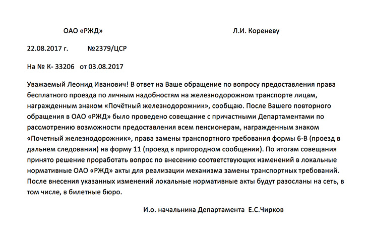 Ответ ОАО РЖД