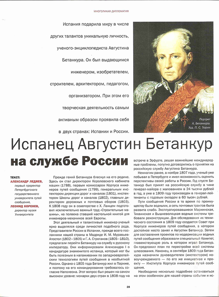 Как-то в конце июня 2007 г. меня срочно из музея вуза вызвал к себе первый проректор нашего ПГУПСа Ледяев А.П. и познакомил с главным редактором журнала «Консул» Олегом Саркисовичем Давтяном. Приближался юбилей европейского масштаба – 250 лет со дня рождения Августина Бетанкура (1 февраля 2008 г.), выдающегося ученого, внесшего значительный вклад в испанскую, французскую и русскую науку и во многие отрасли производств. Самый расцвет его деятельности состоялся в нашей стране. Где он в 1809 г. основал Институт Корпуса Инженеров Путей Сообщения (ИКИПС) и руководил им до 1824 г.