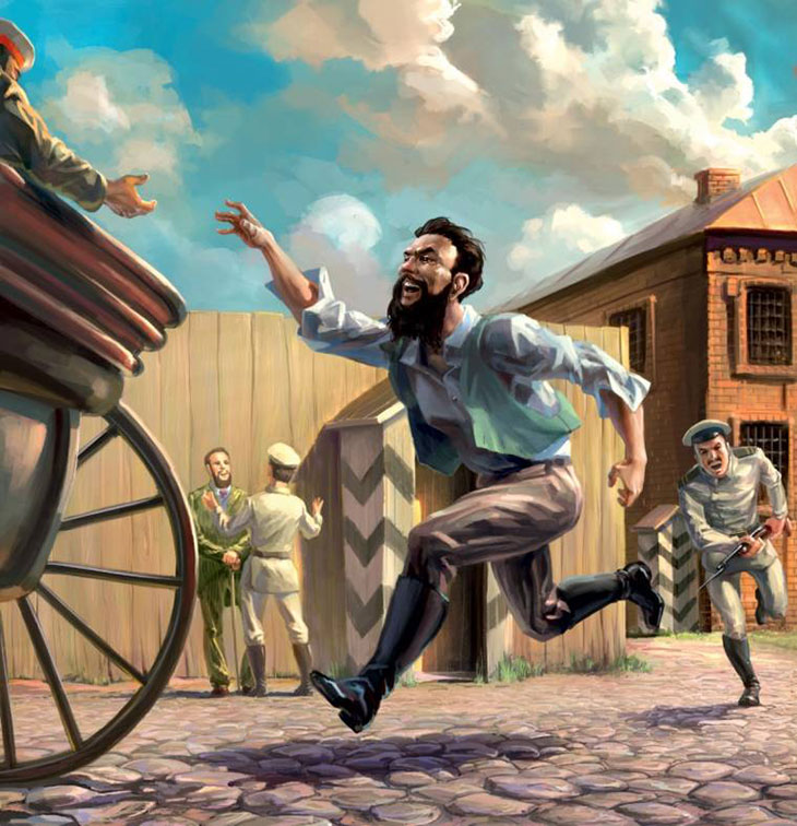 Через два часа арестант вышел по расписанию на прогулку и услышал звуки скрипки. Мелодия сначала то и дело прерывалась, но, когда музыкант выдал бодрую мазурку, стало ясно: сейчас или никогда. Одним движением Кропоткин сбросил мешковатый арестантский халат (он долго тренировался, чтобы это получалось мгновенно) и, оставшись в брюках, рубашке и жилете, рванулся к открытым воротам. «Друзья мои, следившие за всем из окна серенького домика, рассказывали потом, что за мной погнались часовой и три солдата, сидевшие на крылечке тюрьмы. Несколько раз часовой пробовал ударить меня сзади штыком, выбрасывая вперед руку с ружьем. Один раз друзья даже подумали, что вот меня поймали. Часовой не стрелял, так как был слишком уверен, что догонит меня. Но я удержал расстояние. Добежавши до ворот, солдат остановился. (См. рисунок В. Капустина)
