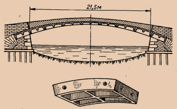 Гесте проводил натурные опыты над этими конструкциями и даже построил из них первый 3-х –пролетный пешеходный мост через р. Пряжку в 1805 г.
