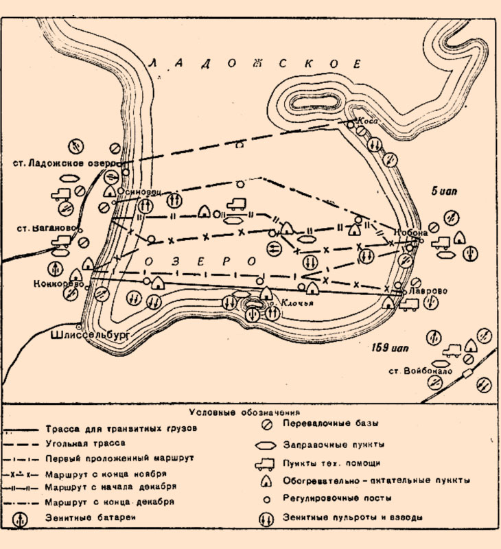Схема ледово-автомобильных дорог через Ладожское озеро зимой 1941-1942 гг.