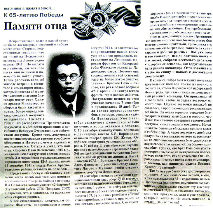 В газете «Наш путь» ПГУПСа от 18 марта 2010 г. была напечатана моя статья «Памяти отца» с обещанием в конце её – отыскать в ближайшие майские праздники, предполагаемое место гибели моего папы Ивана Васильевича Коренева. Обещание было исполнено 2 мая, как раз в день его 100-летия со дня рождения. Предварительно были изучены современные географические карты района у Красного Села и карты времен 1940-х гг. Деревня Рахия нигде не была обнаружена, зато высотка 107.3 м отчетливо выделялась, как на «обнемеченной» карте, так и на картах дня сегодняшнего.