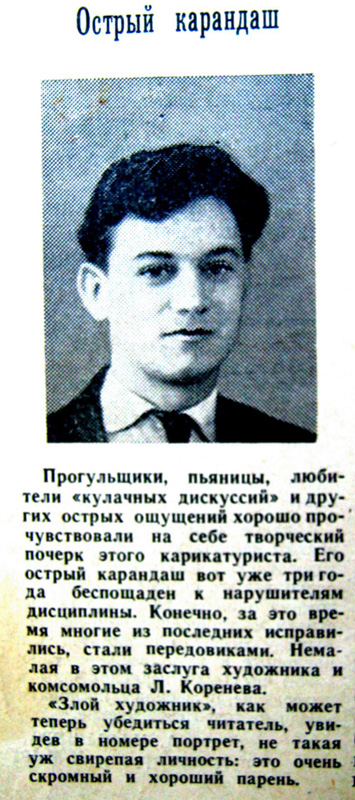 Когда меня в 8 классе выбрали комсоргом, то я решил как-то жизнь общественную оживить. Самолично стал выпускать небольшую стенную газету (на разворот тетрадочного листа) под названием «Фантазия и жизнь». Чтобы газета была злободневной, я стал рисовать карикатуры на одноклассников и даже на себя. Все они были не очень зубастыми, но однажды, возмущенный поведением одного парня, я выдал на него едкую сатиру.